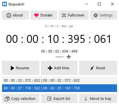 Elapsed and split times can be added to a list in a user-defined string representation, copied to the clipboard or exported to a file.