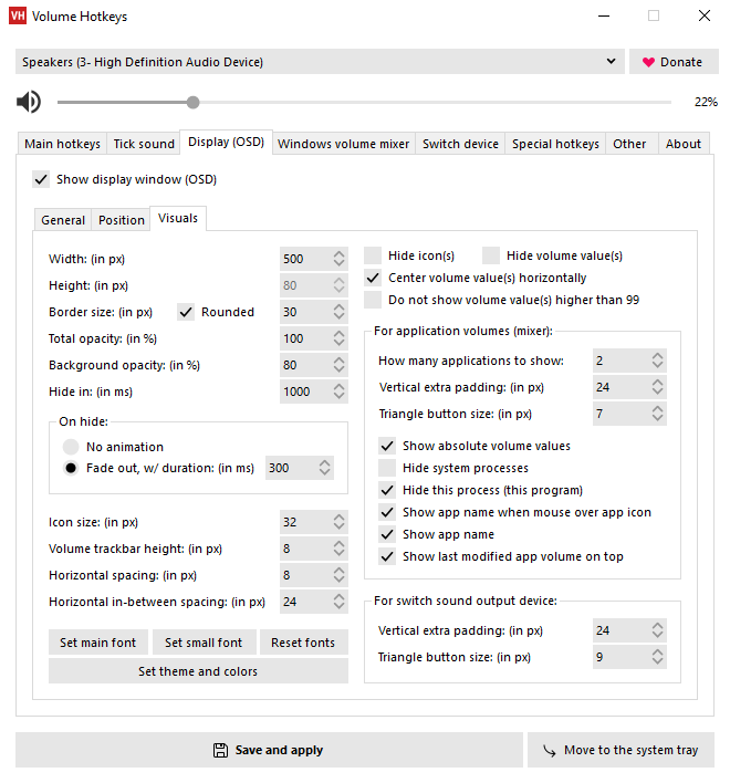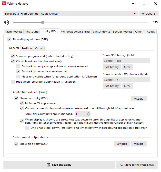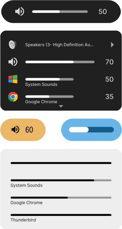 Control your sound volume and output devices with global hotkeys or mouse from anywhere, including games and fullscreen applications.