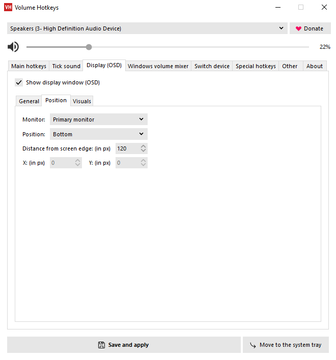 A customizable on-screen display (OSD) window can be shown over other applications. You can separately change the master and application sound volumes with your keyboard or mouse.
